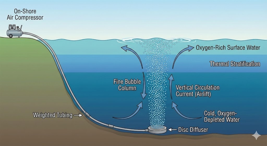 Как это работает: Поднимаясь, пузырьки создают эффект «подъема», называемый эрлифтом. Это вытягивает обедненную кислородом воду со дна на поверхность для взаимодействия с атмосферой, эффективно разрушая термическая стратификация и насыщение кислородом всей толщи воды.