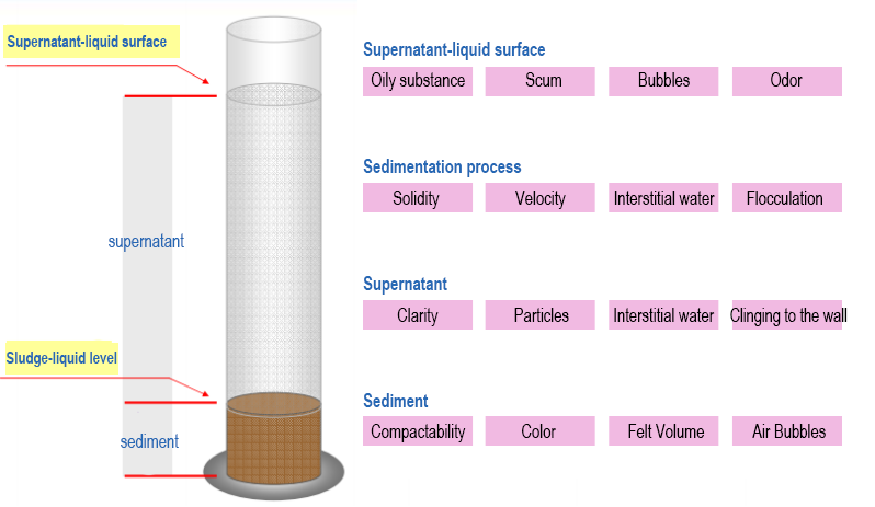 | Интерстициальная вода | Ясность of water between scattered particles. | 1. Чрезмерная аэрация (мелкие частицы все еще видны в воде между крупными частицами); 2. Старение активного ила (прозрачная поровая вода); 3. Чрезмерная нагрузка (мутная поровая вода); 4. Отравление илом (мутные поровые воды). |