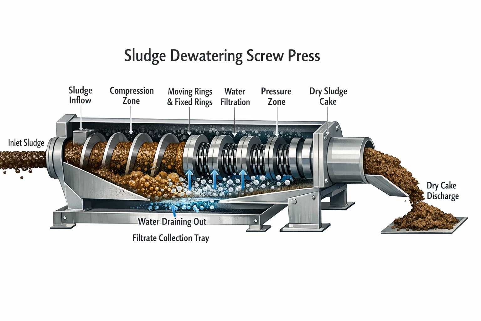 3. Конечная обработка твердых частиц: шнековый пресс для обезвоживания осадка.