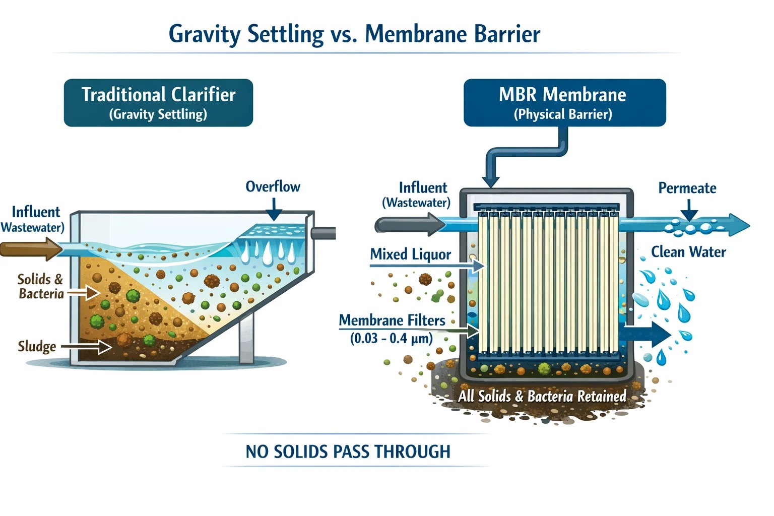 На обычном заводе вы ограничены тем, насколько быстро может опуститься частица. В MBR мы используем физический мембранный барьер (обычно от 0,03 до 0,4 мкм).