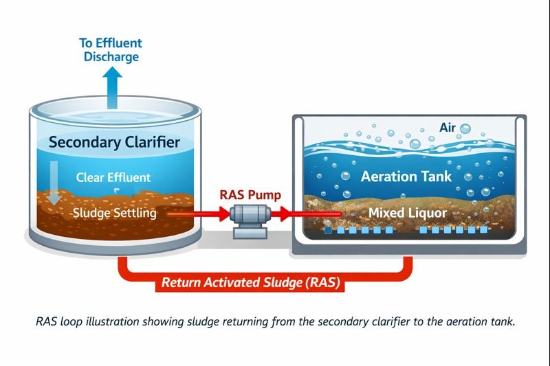 RAS (возврат активированного ила) представляет собой процесс возврата осевшего активного ила из вторичного отстойника обратно в биологический реактор.