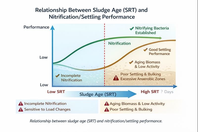 Возраст ила (SRT) — это среднее время пребывания биомассы в системе. Он определяет: