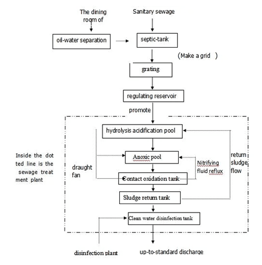 •Технологический процесс-1Сточные воды столовой после прохождения через септический резервуар, разделение масла и воды, а затем сточные воды образуют разделение твердой и жидкой фаз, попадая через решетку, крупные твердые частицы, поплавок перехватывают живые (в разных случаях, перехват решеткой следует регулярно очищать, чтобы предотвратить засорение) через сбор сточных вод, чтобы отрегулировать бассейн, отрегулируйте бассейн, оснащенный контроллером уровня жидкости, когда вода достигнет определенного уровня, запустите подъемное оборудование в интегрированное оборудование для очистки сточных вод.