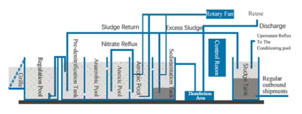 •Технологический процесс-2Блок биохимической очистки использует передовой метод биологического контактного окисления, в основном из1. Гидролитическое подкисление,2. Биохимия гипоксии,3. Контактное окисление,4. Нитрификационный жидкий рефлюкс,5. Рефлюкс ила,6. Вторичное осаждение, аэрация, обеззараживание и другие процессы.
